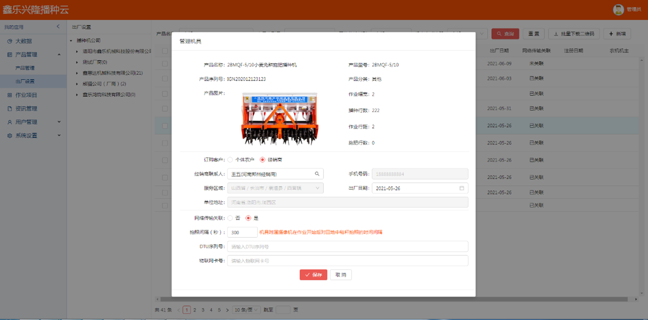 - 產(chǎn)品管理:為播種機(jī)(農(nóng)機(jī))生產(chǎn)廠家和其他農(nóng)資(機(jī))經(jīng)銷商提供產(chǎn)品信息(產(chǎn)品描述、技術(shù)參數(shù)、配置及說明)管理;同時(shí)可為播種機(jī)(農(nóng)機(jī))生產(chǎn)廠家、播種機(jī)(農(nóng)機(jī))經(jīng)銷商提供相應(yīng)的銷售區(qū)域管理。