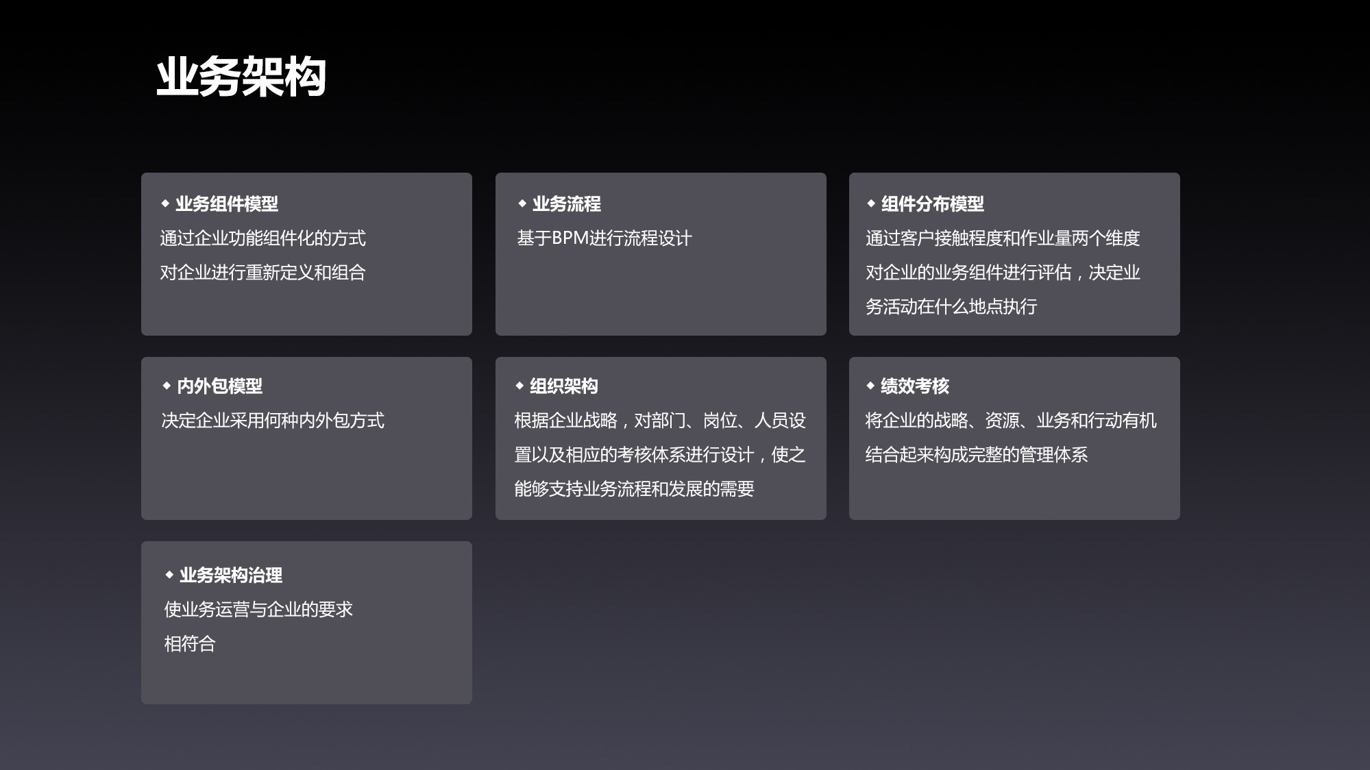 業(yè)務(wù)架構(gòu)從企業(yè)高層視角,“智匯”助力領(lǐng)導(dǎo)者、董事會(huì)與股東,借ARC - BSC平衡計(jì)分卡系統(tǒng)等決策層工具,清晰洞察運(yùn)營計(jì)劃、價(jià)值與挑戰(zhàn),精準(zhǔn)錨定戰(zhàn)略方向。在業(yè)務(wù)模式重塑上,以業(yè)務(wù)組件模型為抓手,通過企業(yè)功能組件化的方式,對(duì)企業(yè)進(jìn)行重新定義和組合,聯(lián)動(dòng)“數(shù)盈”數(shù)據(jù)資產(chǎn)運(yùn)營等服務(wù),打破傳統(tǒng)邊界,構(gòu)建契合戰(zhàn)略的全新業(yè)務(wù)運(yùn)營模式 。